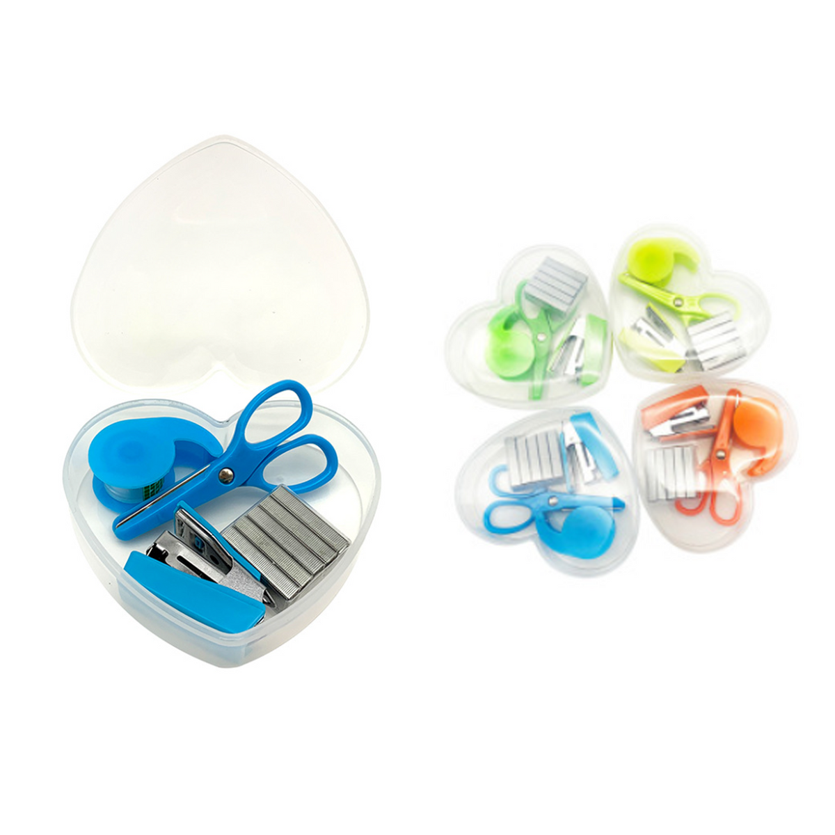 This set includes a mini stapler a tape dispenser a small pair of scissors and 500 staples all housed in a transparent plastic case. The clear box keeps all items organized and visible making it easy to check supplies at a glance. The mini stapler and scissors are compact for space-saving storage while the tape dispenser ensures quick access to tape. Ideal for home offices school desks or travel it handles basic paper tasks like stapling taping and cutting. The plastic case is durable protecting contents from dust and damage and its compact size fits neatly in drawers or bags.
