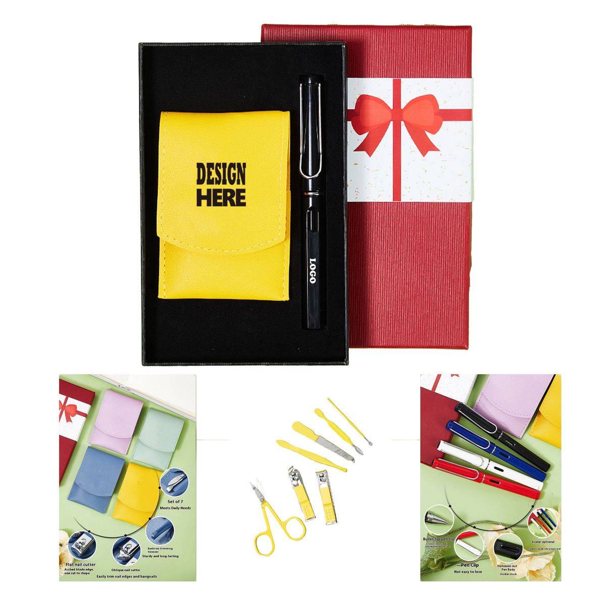 Our gift box features a steel manicure set in a durable PU leather case (4 colors) and a smooth-writing plastic pen (4 colors). Compact, practical, and built to last. Ideal for corporate events, client appreciation, trade shows, or business visits. Box size: 4.65"??7.09". Includes crisp one color two location screen printing. A polished promotional gift??request a free quote today!