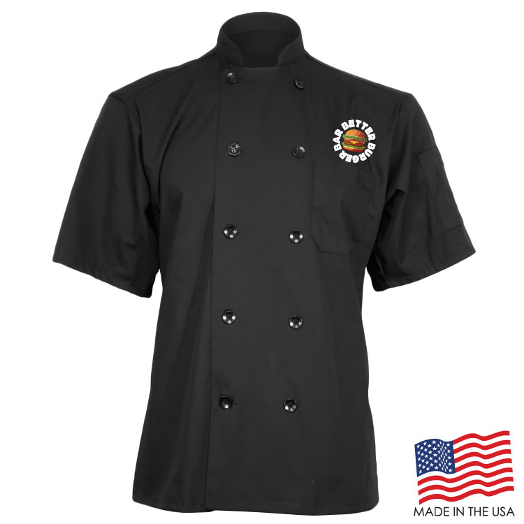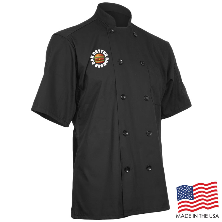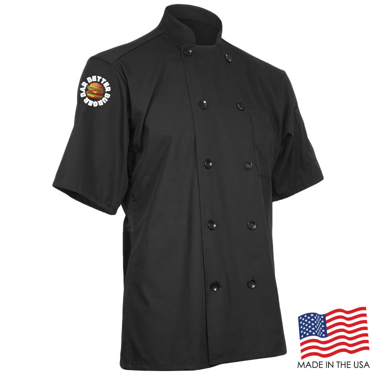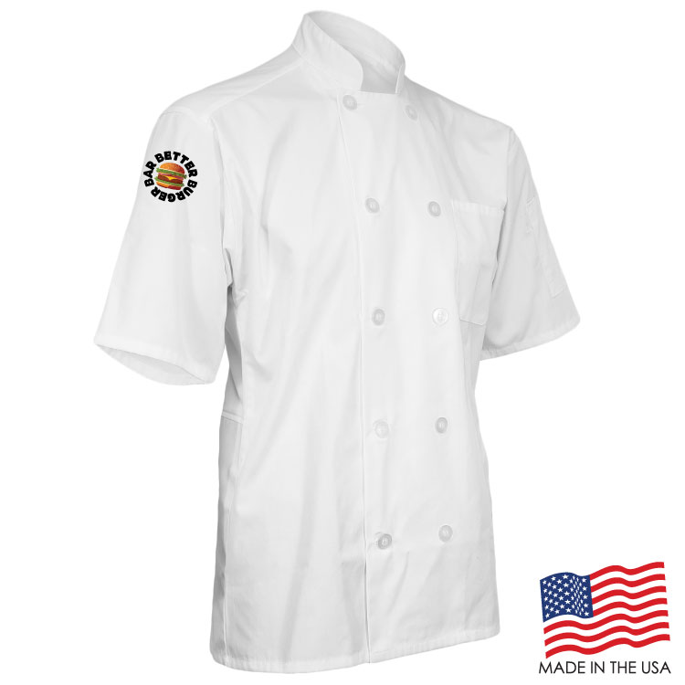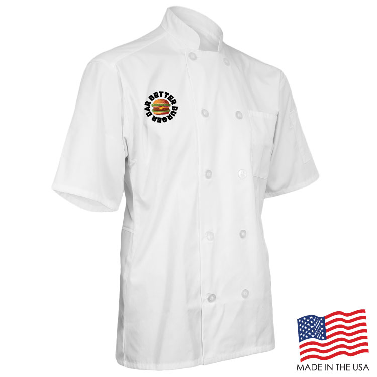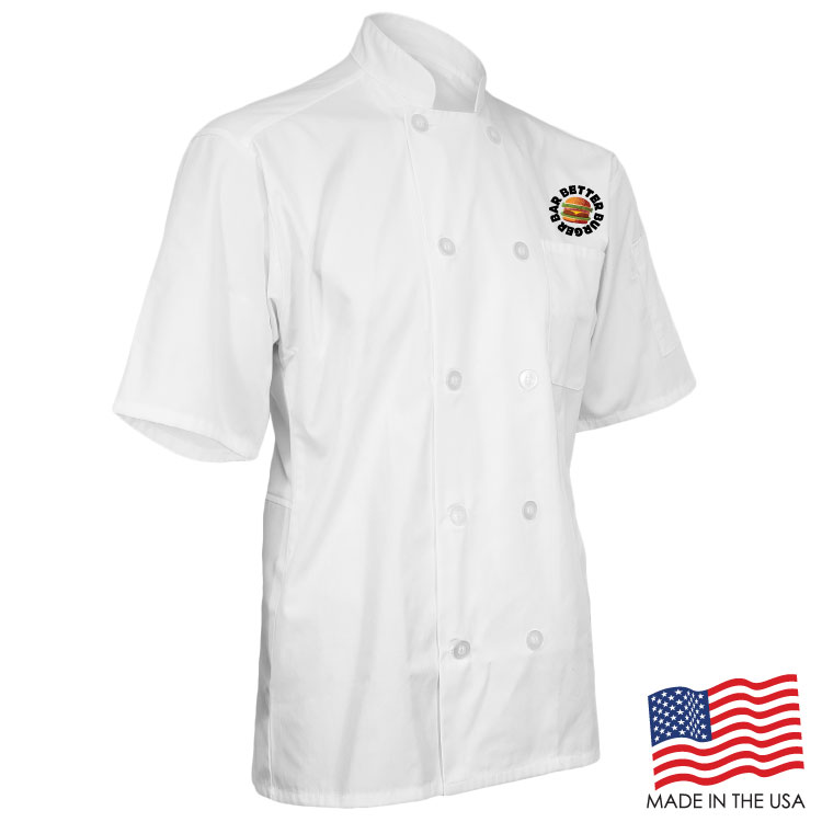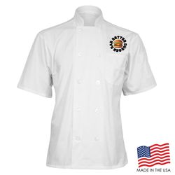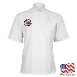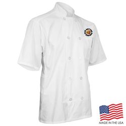 Achieve your culinary dreams when you wear this breathable Short Sleeve Chef Coat with Mesh Back. This double breasted coat is adorned with 10 plastic pearl buttons, mitered breast pocket and a thermometer pocket on the sleeve. The coat is a unisex style and made of a Poplin Polyester/Cotton blend. Sizes run large and therefore we recommend ordering a size down or reviewing the size chart. This product can be customized with a thermal transfer full color logo using Formula Guide Solid Coated Pantones (PMS C), Formula Guide Solid Uncoated Pantones (PMS U), or with your own color(s) to print as is. OVERCHARGE APPLIES FOR UPSIZES 2XL AND UP.