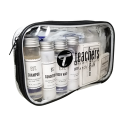 Clear PVC bag for travel, packs flat for full view of contents. Kit includes 1.41 oz. EST collection of shampoo, conditioner, bath gel, lotion, hand bar, body massage bar, 1 oz. Healthy Hands hand sanitizer. Vanity kit of cotton swabs, sewing kit and nail file. Toothbrush, toothpaste, shower cap, razor, shave cream, Satin eye mask, and sock slippers with grip.