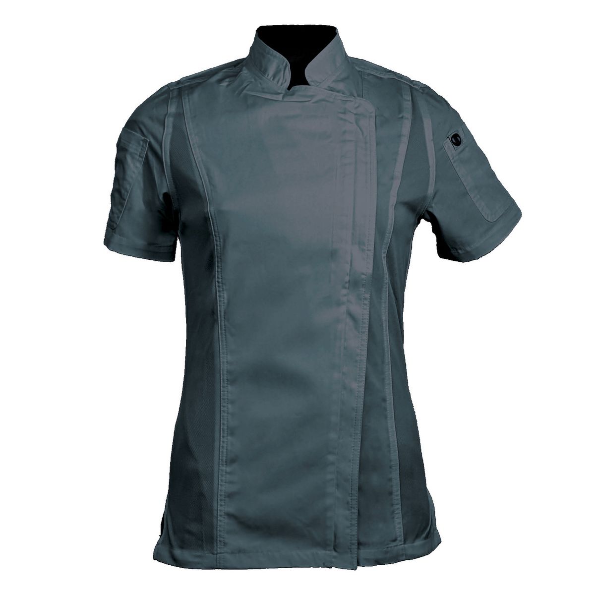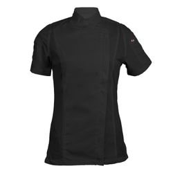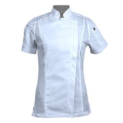 Achieve your culinary dreams when you wear this fashionable Women's Short Sleeve Modern Chef Coat (BLANK). This chef coat features a zipper closure, mesh side panels, and pockets on both sleeves. The coat is a Women's style and made of a Poplin Polyester/Cotton blend. Sizes run large and therefore we recommend ordering a size down or reviewing the size chart. Product is sold blank. OVERCHARGE APPLIES FOR UPSIZES 2XL AND UP.