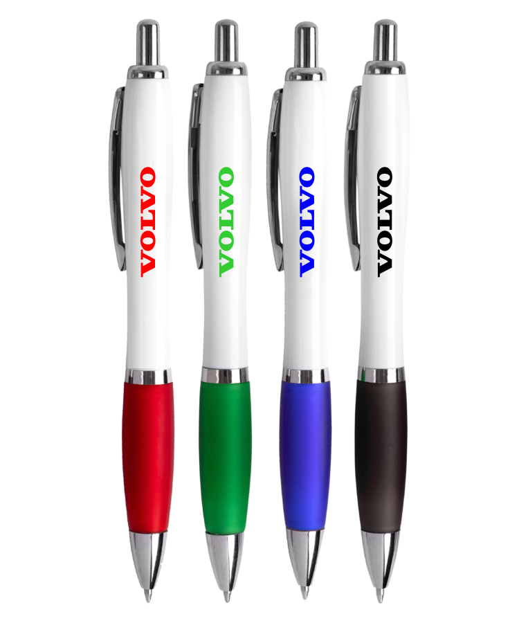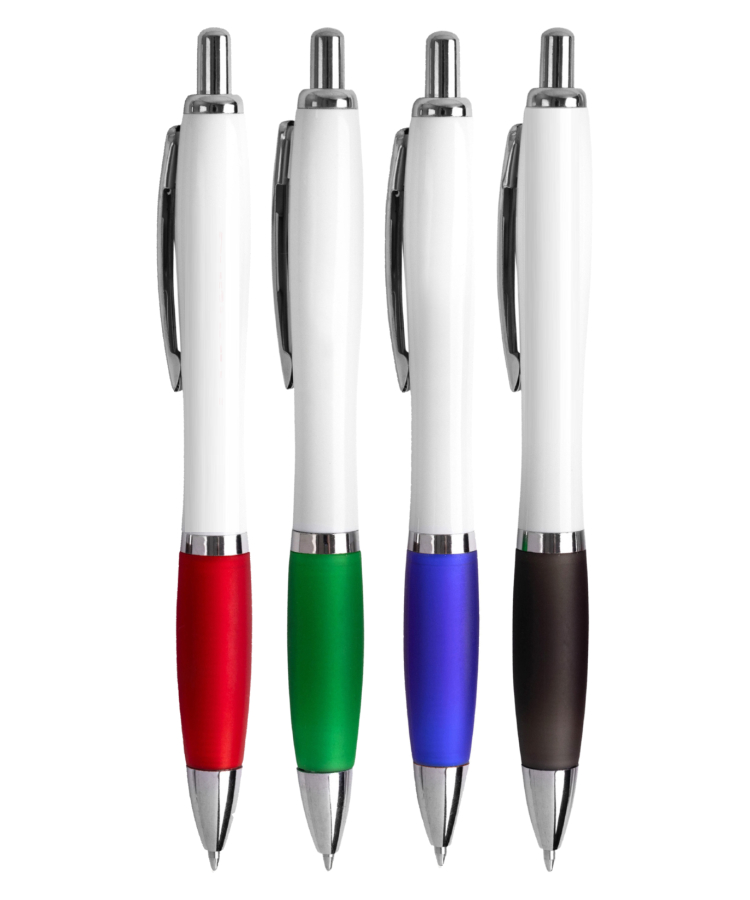 The Rio Retractable White Click Pen features a sleek curved white barrel, vibrant color grip, and polished chrome accents for a clean, modern look.